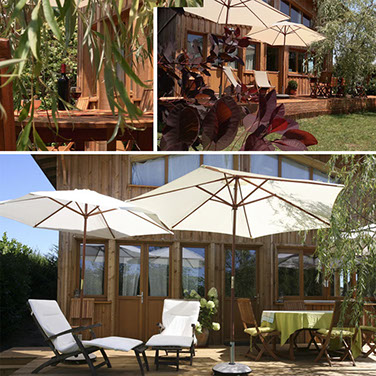 Grande terrasse en bois donnant sur jardin privatif ou l'on peut prendre ses repas, un bain de soleil et profiter du jardin .
