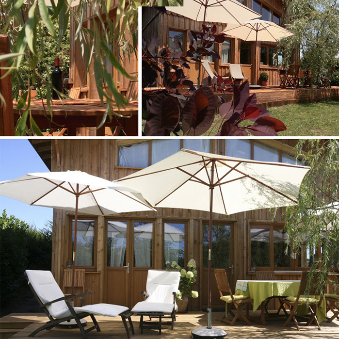 Grande terrasse en bois donnant sur jardin privatif ou l'on peut prendre ses repas , un bain de soleil et profiter du jardin .